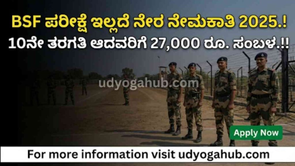 ನಮಸ್ಕಾರ ಸ್ನೇಹಿತರೆ ಇಂದಿನ ಈ ಒಂದು ಲೇಖನಕ್ಕೆ ಸ್ವಾಗತ ಇದೀಗ ಪ್ರಸ್ತುತ ಇಂದಿನ ಈ ಒಂದು ಲೇಖನದಲ್ಲಿ ನಾವು ಬಿಎಸ್ಎಫ್ ಪರೀಕ್ಷೆ ಇಲ್ಲದೆ ನೇರ.ನೇಮಕಾತಿ 2025 ಇದರ ಕುರಿತು ಸಂಪೂರ್ಣ ಮಾಹಿತಿಯನ್ನು ತಿಳಿದುಕೊಂಡು ಬರೋಣ ಬನ್ನಿ.