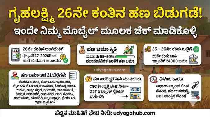 ಪ್ರಸ್ತುತ ಈ ಲೇಖನದಲ್ಲಿ 26ನೇ ಕಂತಿನ ಸಂಪೂರ್ಣ ಮಾಹಿತಿ, ಹಣ ಜಮಾ ಸ್ಥಿತಿ, ವಿಳಂಬಕ್ಕೆ ಕಾರಣಗಳು, ಹಣ ಬರದಿದ್ದರೆ ಏನು ಮಾಡಬೇಕು, ಮುಂದಿನ ಕಂತಿನ ನಿರೀಕ್ಷೆ ಮತ್ತು ಯೋಜನೆಯ ಮಹತ್ವವನ್ನು ಸರಳವಾಗಿ ವಿವರಿಸಲಾಗಿದೆ.