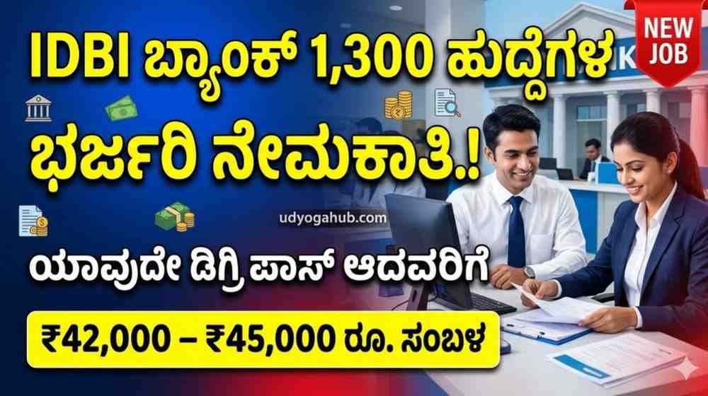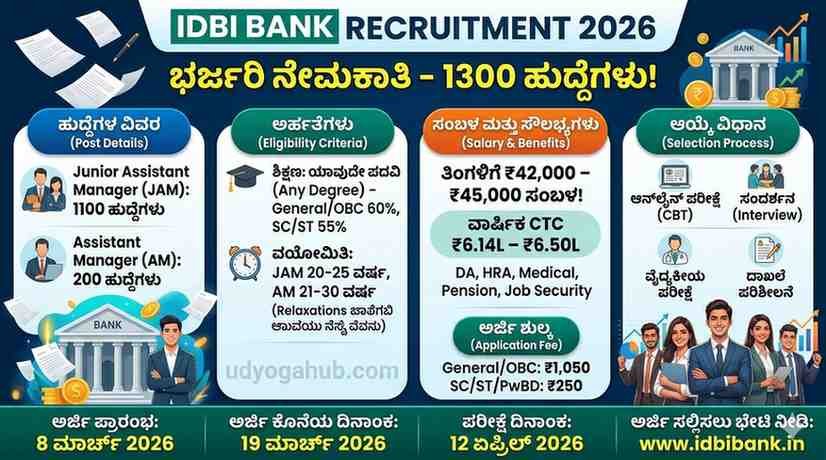 IDBI ಬ್ಯಾಂಕ್ ನೇಮಕಾತಿ 2026 ಬ್ಯಾಂಕಿಂಗ್ ಕ್ಷೇತ್ರದಲ್ಲಿ ಸರ್ಕಾರಿ ಉದ್ಯೋಗ ಪಡೆಯಲು ಬಯಸುವ ಅಭ್ಯರ್ಥಿಗಳಿಗೆ ಅತ್ಯುತ್ತಮ ಅವಕಾಶವಾಗಿದೆ. ಒಟ್ಟು 1,300 ಹುದ್ದೆಗಳು ಲಭ್ಯವಿರುವುದರಿಂದ ಸ್ಪರ್ಧೆ ಹೆಚ್ಚಾಗುವ ಸಾಧ್ಯತೆ ಇದೆ. ಆದ್ದರಿಂದ ಅರ್ಹ ಅಭ್ಯರ್ಥಿಗಳು ಅರ್ಜಿ ಕೊನೆಯ ದಿನಾಂಕದವರೆಗೆ ಕಾಯದೆ ತಕ್ಷಣವೇ ಅರ್ಜಿ ಸಲ್ಲಿಸುವುದು ಉತ್ತಮ.
