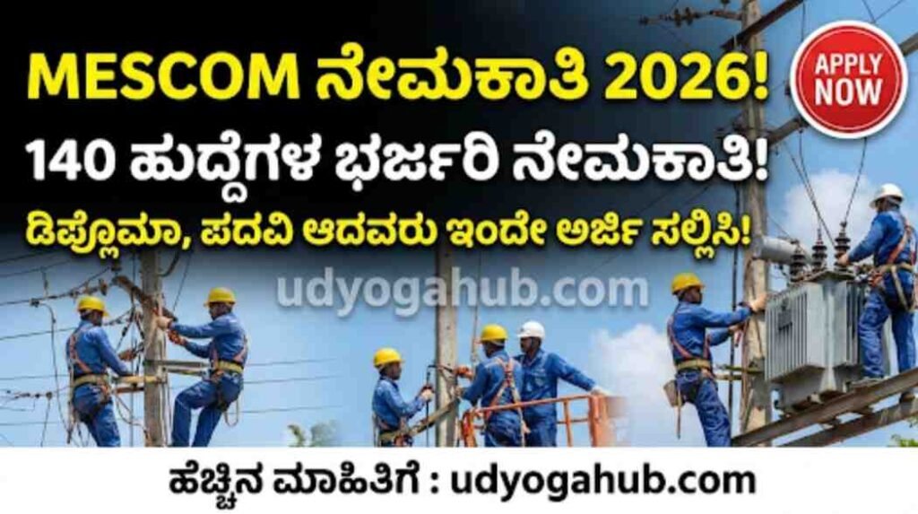 ನಿಮಗೆಲ್ಲ ತಿಳಿದಿರುವ ಹಾಗೆ ಕರ್ನಾಟಕ ರಾಜ್ಯದ ವಿದ್ಯುತ್ ವಿತರಣಾ ಕ್ಷೇತ್ರದಲ್ಲಿ ಪ್ರಮುಖ ಸ್ಥಾನ ಹೊಂದಿರುವಂತ ಮಂಗಳೂರು ವಿದ್ಯುತ್ ಸರಬರಾಜು ಕಂಪನಿ ಲಿಮಿಟೆಡ್ (MESCOM) ಸಂಸ್ಥೆಯು 2026ನೇ ಸಾಲಿನ Apprentice ನೇಮಕಾತಿ ಅಧಿಸೂಚನೆಯನ್ನು ಅಧಿಕೃತವಾಗಿ ಬಿಡುಗಡೆ ಮಾಡಿದೆ. ಈ ಅಧಿಸೂಚನೆಯ ಮೂಲಕ ಒಟ್ಟು 140 Apprentice ಹುದ್ದೆಗಳನ್ನು ನೇಮಕಾತಿ ಮಾಡಲು ಅರ್ಹ ಅಭ್ಯರ್ಥಿಗಳಿಂದ ಆನ್ಲೈನ್ ಮೂಲಕ ಅರ್ಜಿ ಆಹ್ವಾನಿಸಲಾಗಿದೆ.
