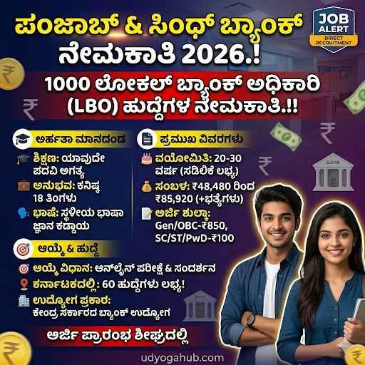 ಪಂಜಾಬ್ ಅಂಡ್ ಸಿಂಧ್ ಬ್ಯಾಂಕ್ (Punjab and Sind Bank) 2026ನೇ ಸಾಲಿಗೆ ಲೋಕಲ್ ಬ್ಯಾಂಕ್ ಅಧಿಕಾರಿ (LBO) ಹುದ್ದೆಗಳಿಗಾಗಿ ಅಧಿಕೃತ ನೇಮಕಾತಿ ಪ್ರಕಟಣೆ ಹೊರಡಿಸಿದೆ. ಒಟ್ಟು 1000 ಹುದ್ದೆಗಳು ಖಾಲಿ ಇದ್ದು, ಈ ನೇಮಕಾತಿ ದೇಶದ ವಿವಿಧ ರಾಜ್ಯಗಳಲ್ಲಿ ನಡೆಯಲಿದೆ.