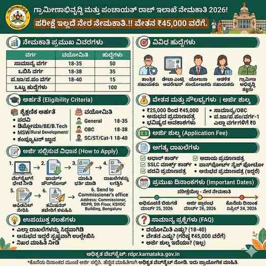 ಕರ್ನಾಟಕ ಗ್ರಾಮೀಣಾಭಿವೃದ್ಧಿ ಮತ್ತು ಪಂಚಾಯತ್ ರಾಜ್ (RDPR) ಇಲಾಖೆ 2026ನೇ ಸಾಲಿಗೆ ಹೊಸ ನೇಮಕಾತಿ ಅಧಿಸೂಚನೆಯನ್ನು ಬಿಡುಗಡೆ ಮಾಡಿದೆ.